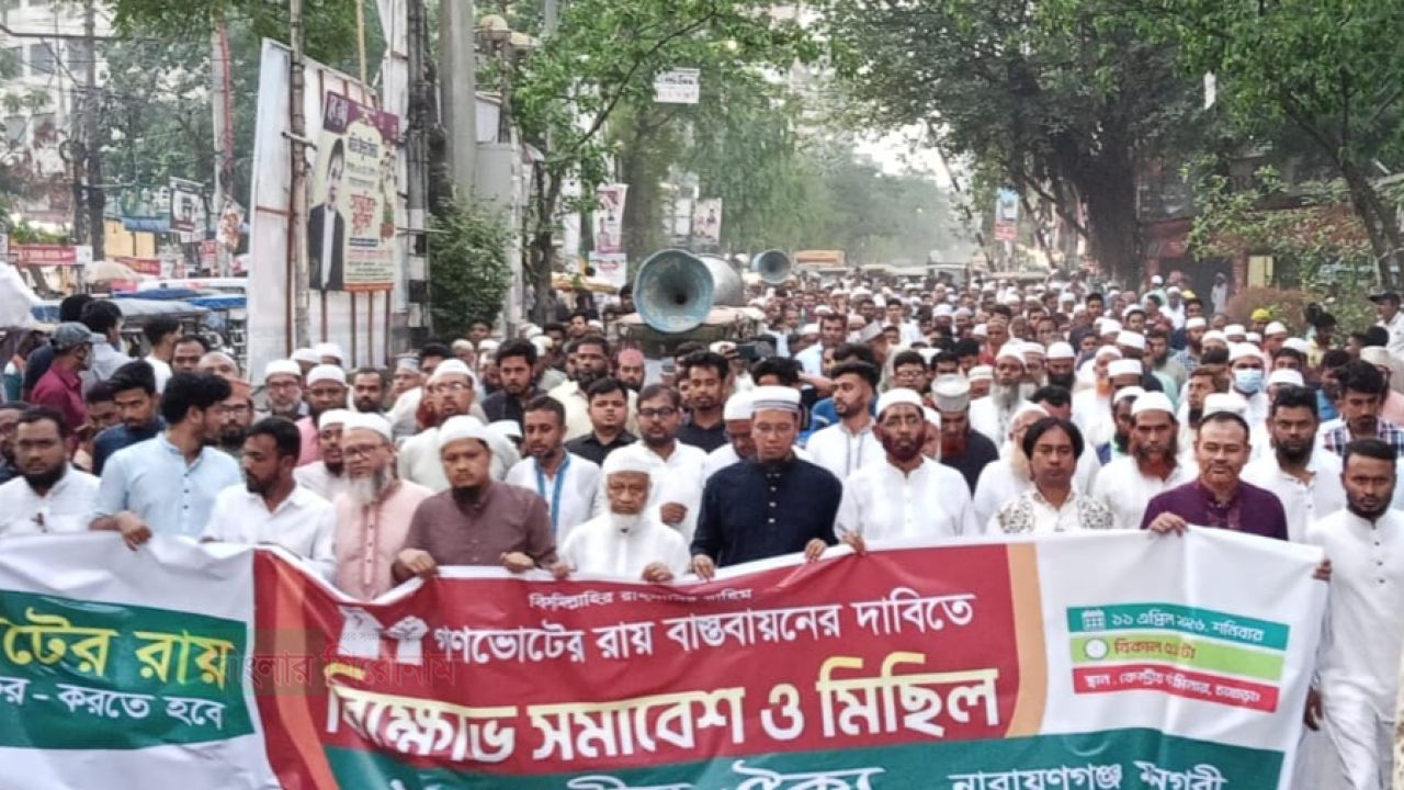 গণভোটের রায় বাস্তবায়নের দাবিতে নারায়ণগঞ্জে ১১ দলীয় ঐক্যের বিক্ষোভ ও মিছিল